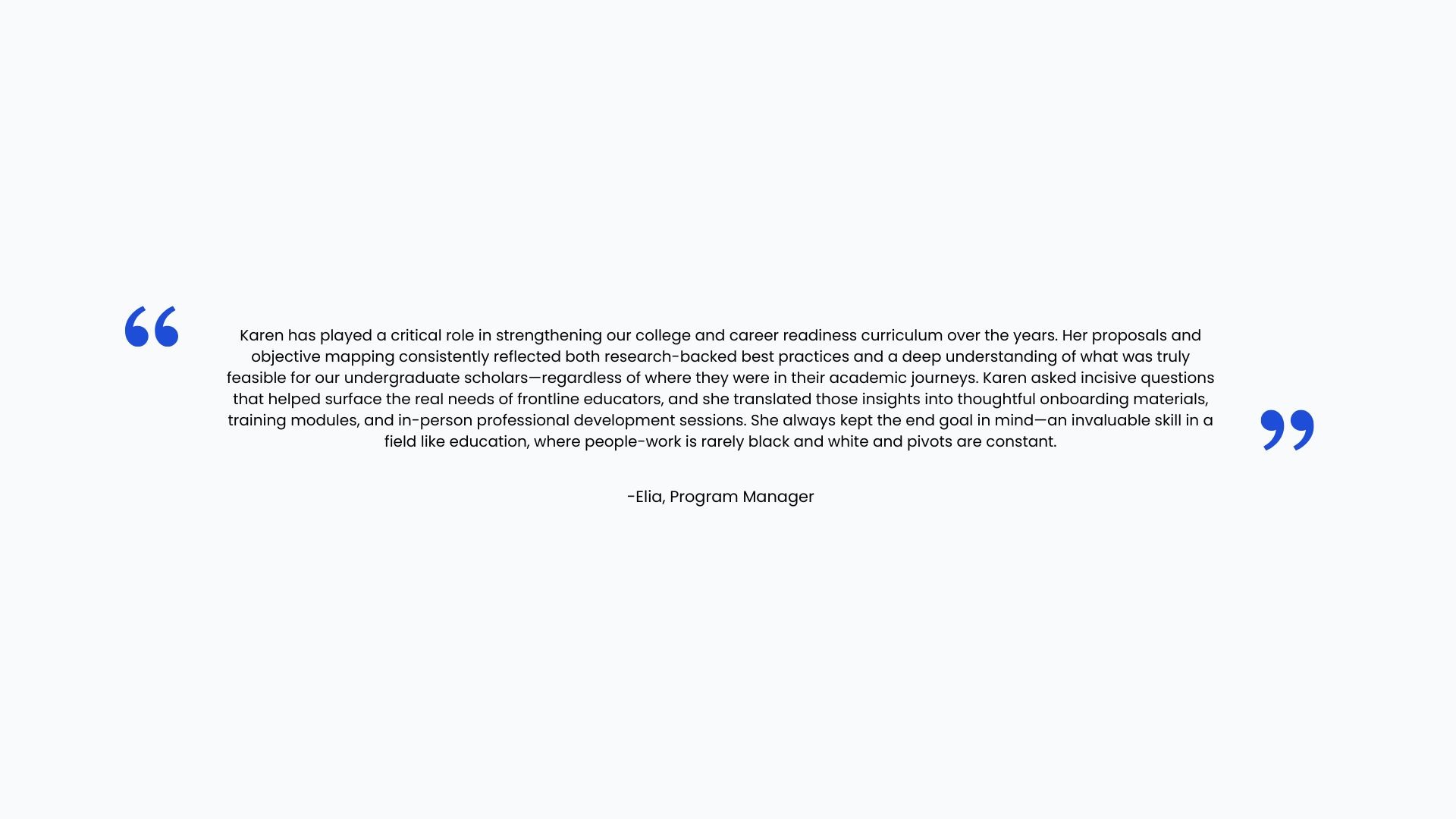Karen has played a critical role in strengthening our college and career readiness curriculum over the years. Her proposals and objective mapping consistently reflected both research-backed best practices and a deep understanding of what was truly feasible for our undergraduate scholars—regardless of where they were in their academic journeys. Karen asked incisive questions that helped surface the real needs of frontline educators, and she translated those insights into thoughtful onboarding materials, training modules, and in-person professional development sessions. She always kept the end goal in mind—an invaluable skill in a field like education, where people-work is rarely black and white and pivots are constant.