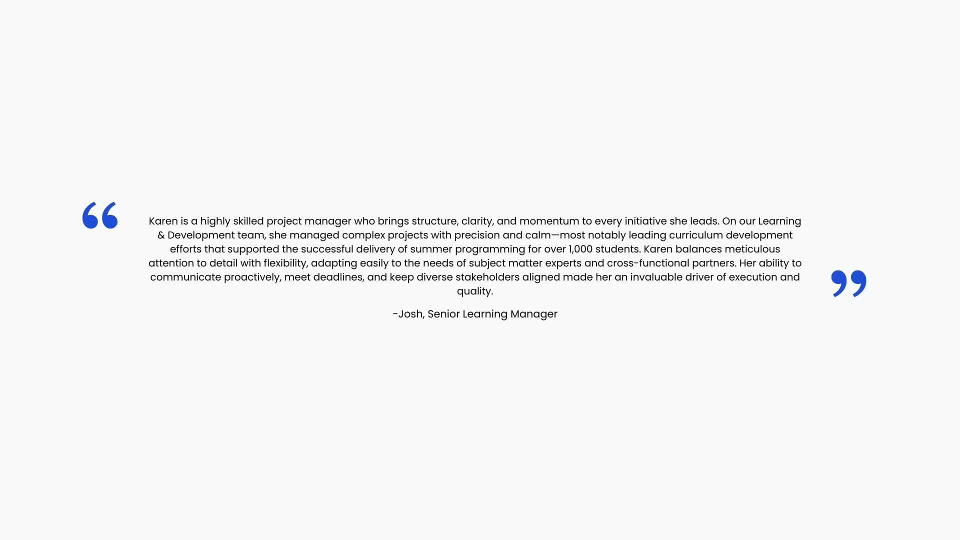 Karen is a highly skilled project manager who brings structure, clarity, and momentum to every initiative she leads. On our Learning & Development team, she managed complex projects with precision and calm—most notably leading curriculum development efforts that supported the successful delivery of summer programming for over 1,000 students. Karen balances meticulous attention to detail with flexibility, adapting easily to the needs of subject matter experts and cross-functional partners. Her ability to communicate proactively, meet deadlines, and keep diverse stakeholders aligned made her an invaluable driver of execution and quality.