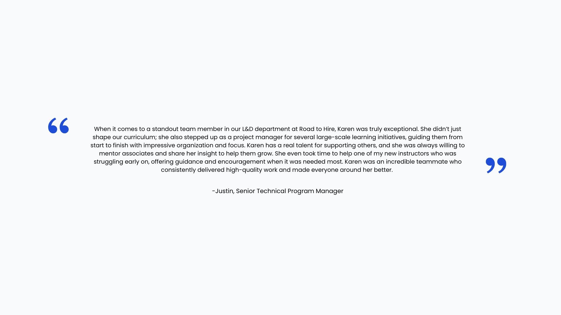 When it comes to a standout team member in our L&D department at Road to Hire, Karen was truly exceptional. She didn’t just shape our curriculum; she also stepped up as a project manager for several large-scale learning initiatives, guiding them from start to finish with impressive organization and focus. Karen has a real talent for supporting others, and she was always willing to mentor associates and share her insight to help them grow. She even took time to help one of my new instructors who was struggling early on, offering guidance and encouragement when it was needed most. Karen was an incredible teammate who consistently delivered high-quality work and made everyone around her better.